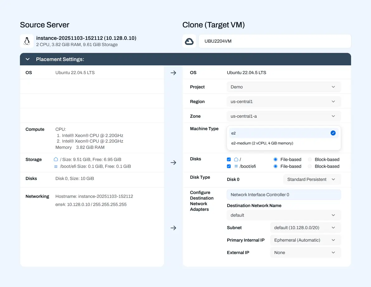 Our platform natively supports Google Cloud APIs and services, enabling frictionless migration of workloads from on-prem, VMware, physical servers, or other clouds. This tight integration ensures maximum compatibility, security, and visibility throughout the migration lifecycle.